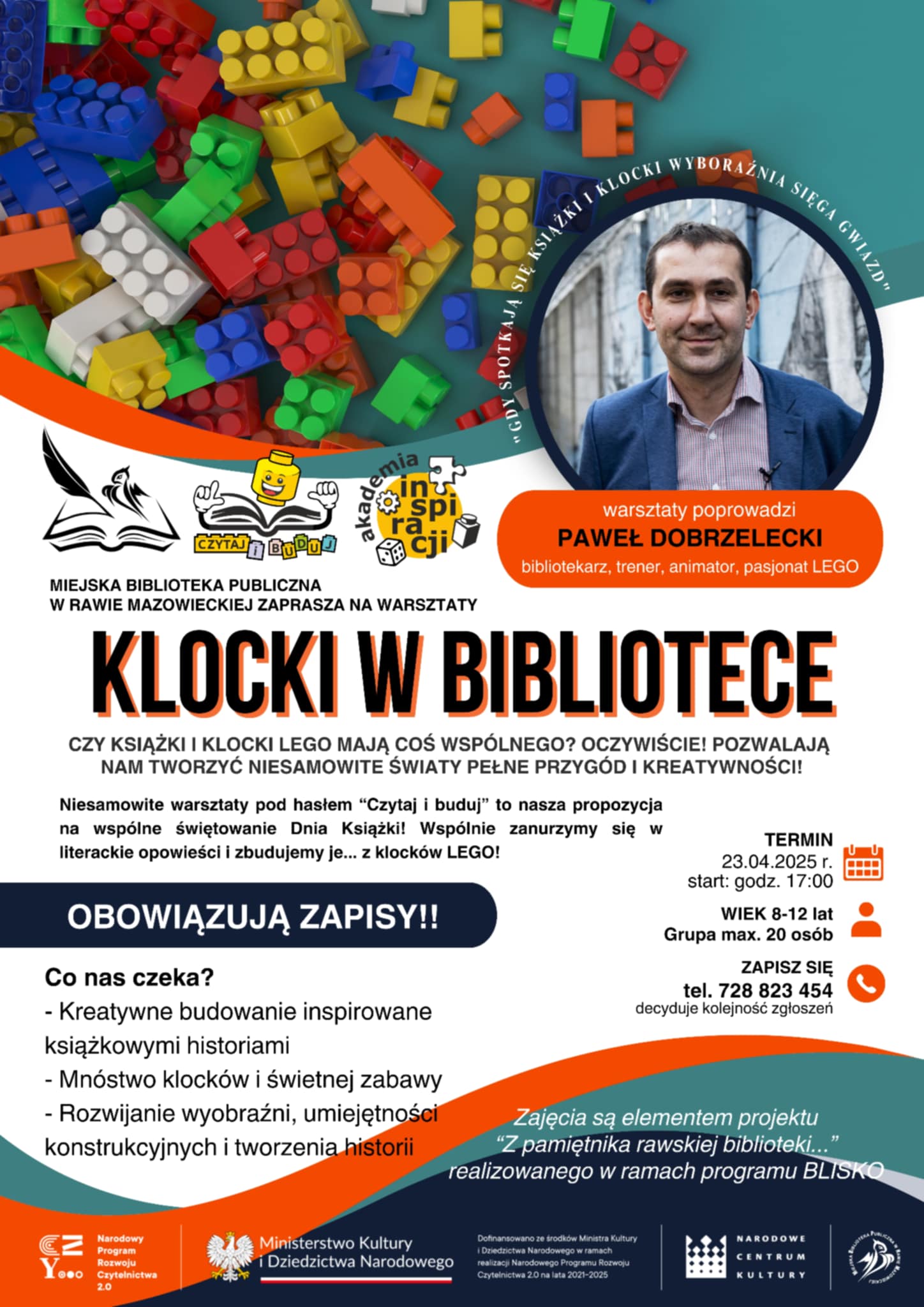 Zaj臋cia poprowadzi Pawe艂 Dobrzelecki, bibliotekarz, trener, animator, a prywatnie pasjonat LEGO i serdeczny Przyjaciel naszej biblioteki
