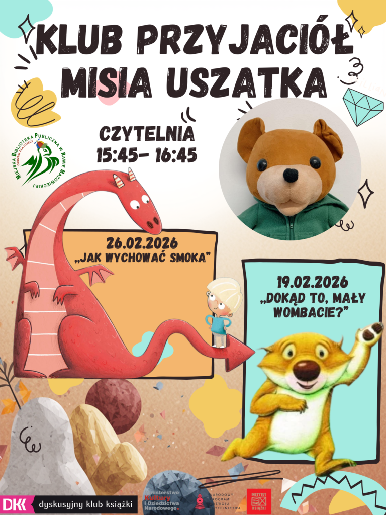 Zapraszamy dzieci wraz z opiekunami na kolejne spotkania Klubu Przyjaciół Misia Uszatka, organizowane w czytelni biblioteki. Cykl ten został stworzony z myślą o najmłodszych czytelnikach i ma na celu rozwijanie zainteresowań czytelniczych, kształtowanie wrażliwości oraz budowanie pozytywnych relacji z książką już od najwcześniejszych lat.