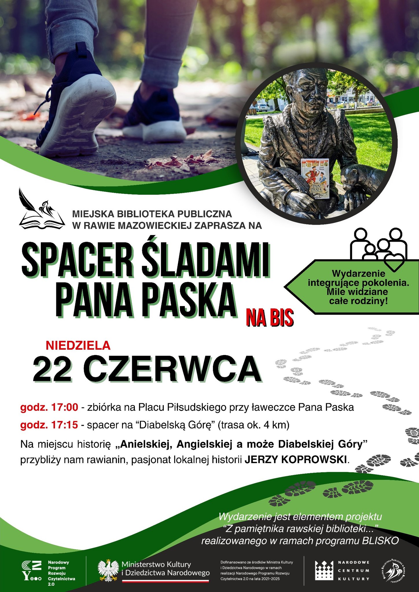 Spacery śladami Pana Paska realizujemy w ramach naszego projektu BLISKO – „Z pamiętnika rawskiej biblioteki”, który uzyskał dofinansowanie ze środków Ministra Kultury i Dziedzictwa Narodowego w ramach realizacji Narodowego Programu Rozwoju Czytelnictwa 2.0. na lata 2021-2025.
