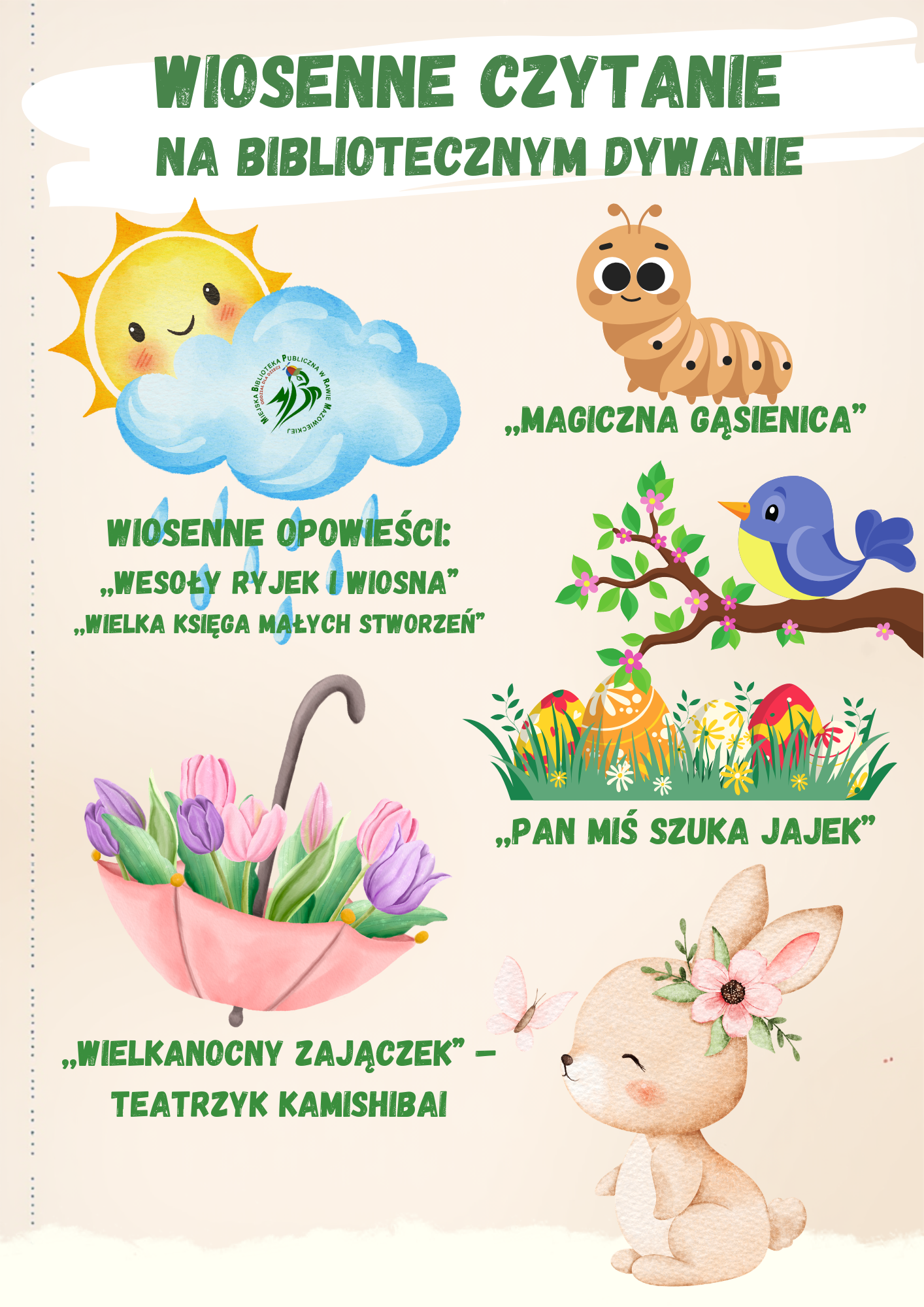 Wiosna to czas budzącej się do życia przyrody, pierwszych promieni słońca i nowych inspiracji. To idealny moment, by usiąść wspólnie na bibliotecznym dywanie, wsłuchać się w opowieści pełne kolorów, radości i ciepła, a następnie twórczo je przeżyć podczas działań plastycznych.